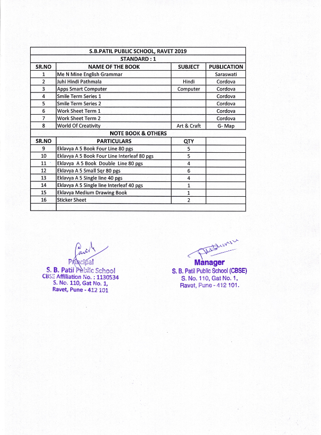 First Standard Students Book List Of S B Patil School Ravet